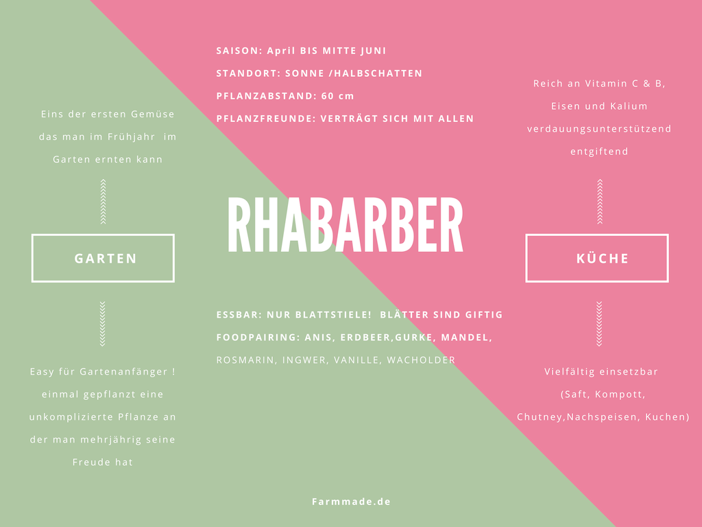 Alles Wissenswerte zu Rhabarber in Garten und Küche findest du auf einen Blick auch in der nachfolgenden Infografik, die wir für dich gestaltet haben. Als eines der ersten Gemüse im Garten kann er schon ab April geerntet werden. Er hat viel Vitamin C & B, Eisen und Kalium. Unterstützt die Verdauung, wirkt entgiftend und enthält wenig Zucker. Ein richtiges Powerpaket. Rhabarber kann man vielfältig in der Küche einsetzten. Häufig wird er als Saft, für Kompotte, süße Nachspeisen und Kuchen verwendet.