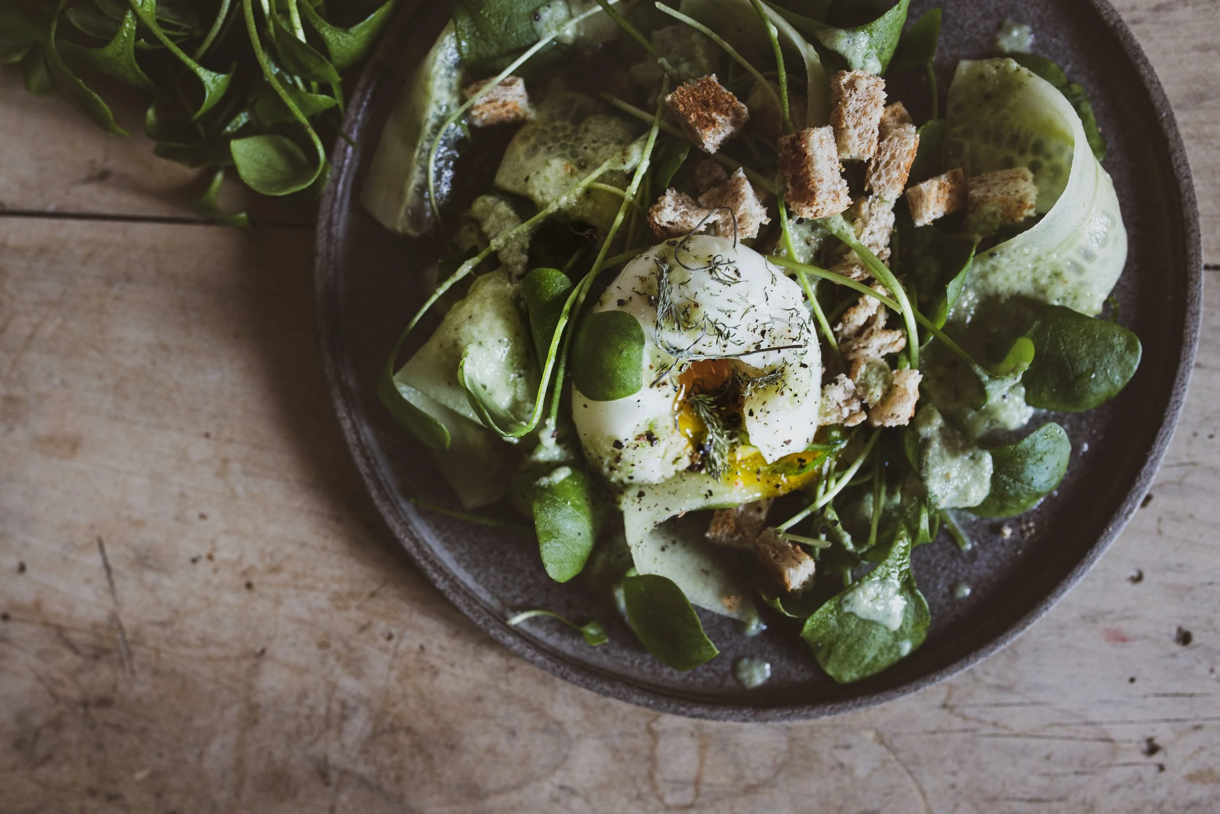 Die gepellten Eier auf dem Salat anrichten und mit einem Messer leicht anschneiden, sodass das flüssige Eigelb herausläuft. Darauf ein wenig grünes Dressing verteilen. Den Salat mit etwas Dill und ein paar gerösteten Weißbrotwürfeln garniert servieren.